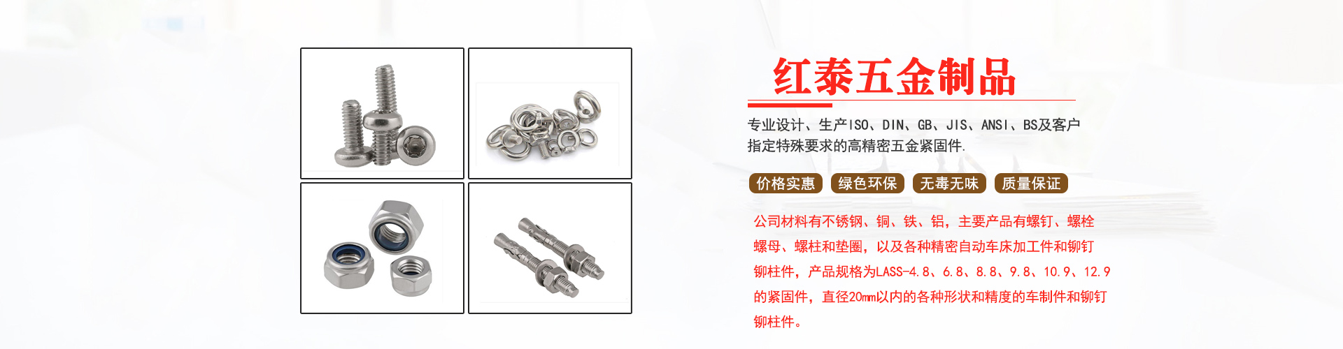 公司材料有不銹鋼、銅、鐵、鋁,主要產(chǎn)品有螺釘、螺栓、螺母、螺柱和墊圈,以及各種精密自動車床加工件和鉚釘鉚柱件,產(chǎn)品規(guī)格為LASS-4.8、6.8、8.8、9.8、10.9、12.9的緊固件,直徑20mm以內(nèi)的各種形狀和精度的車制件和鉚釘鉚柱件。